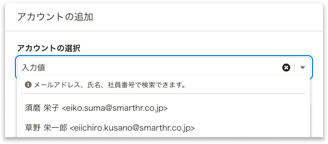 SmartHRのアカウントを選択します。単一選択の場合はSingleComboboxを使ってください。複数まとめて追加する場合はMultiComboboxを使ってください。