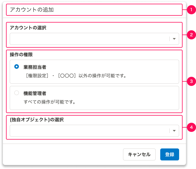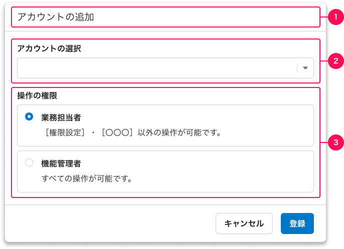 詳細ダイアログ(アカウントのみ) スクリーンショット:1〜3とグルーピングされた赤枠がスクリーンショット上に表示、強調されている。タイトルが1、アカウントの選択が2、操作の権限が3でグルーピングされている。