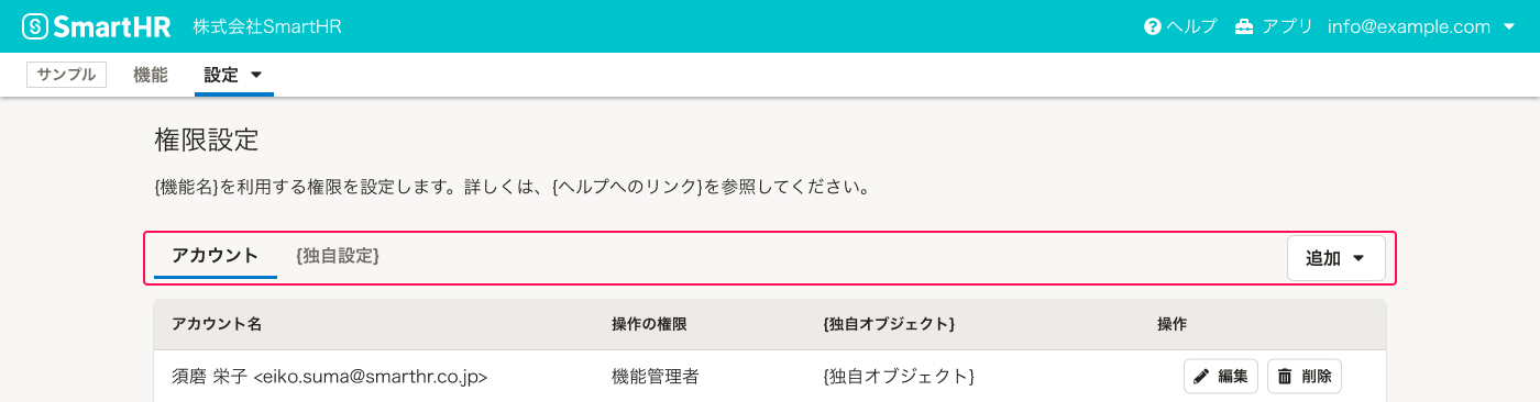 独自の権限設定がある場合に表示します。用途によって設定が異なるため、基準やパターンは定めません。